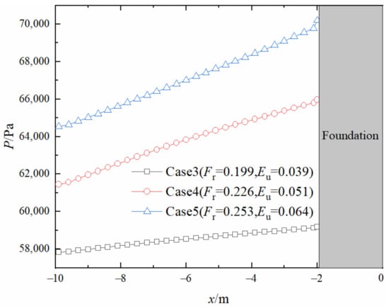 The Figure 23 displays the relationship between Seq/D and Fr of the present study. In order to compare with the simulating results, the experimental data of Corvaro et al. [] was also depicted in Figure 23. As shown in Figure 23, the equilibrium scour depth appears a logarithmic increase as Fr increases and approaches the mathematical asymptotic value, which is also consistent with the experimental results of Corvaro et al. []. According to Figure 24, the adverse pressure gradient pressure at upstream USAF edges increases with the increase of Fr, which is benefit for the wave boundary layer separating from seabed, resulting in the high-intensity horseshoe vortex, hence, causing intensive scour around USAF. Based on the previous study of Tavouktsoglou et al. [] for scour around pile under currents, the high Fr leads to the stagnation point is closer to the mean sea level for shallow water, causing the stronger downflow kinetic energy. As mentioned in previous section, the energy of downflow at upstream makes up the energy of the subsequent horseshoe vortex, so the stronger downflow kinetic energy results in the more intensive horseshoe vortex. Therefore, the higher Fr leads to the more intensive horseshoe vortex by influencing the position of stagnation point y presumably. Qi and Gao [] carried out a series of flume tests to investigate the scour around pile under regular waves, and proposed the fitting formula between Seq/D and Fr as following