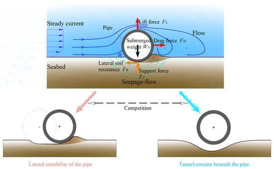 Under the action of ocean currents, the flow over a partially embedded pipeline and the seepage flow within the underlying soil can be generated concurrently, as illustrated in Figure 1. Thus, the on-bottom stability of a submarine pipeline involves complex flow–pipe–soil interactions [7,8], but not only limits to the pipe–soil interaction [9]. When the lateral soil resistance provided by the seabed soil is insufficient to balance the hydrodynamic drag force on the pipeline, the pipeline will breakout laterally from its original location; i.e., lateral instability takes place (see DNV [10]). Meanwhile, if the seepage failure is triggered within the underlying soil due to the pressure drop from the upstream to the downstream of the pipe, tunnel erosion beneath the pipe can also be induced, and further result in the pipeline spanning (see DNVGL [11]).