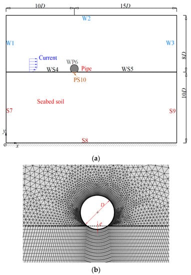 As illustrated in Figure 2a, the geometry of the coupled finite element (FE) model mainly consisted of three domains; i.e., the water, the pipeline, and the soil. In the present simulation, a pipe was located on the seabed surface with an embedment (e), the water depth was set as 8D, and the soil depth was chosen as 10D, in which D is the outer diameter of pipe. The left and the right boundaries were 10D and 15D from the center of the pipe, respectively. Such sizes of the water and soil domains were proved to be sufficient to eliminate blockage and boundary effects (see Gao and Luo [20]).