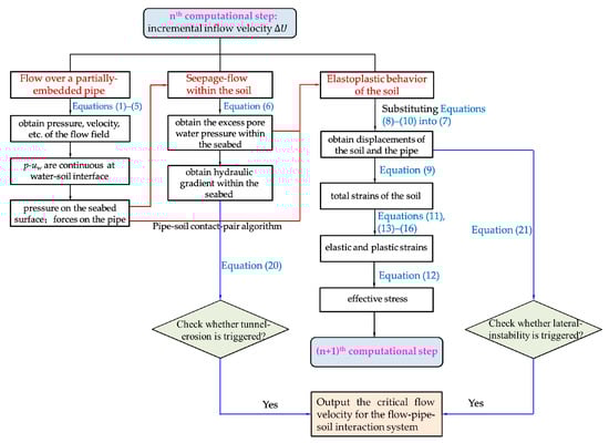 In the present study, a coupled flow-seepage-elastoplastic modeling approach was proposed that is capable of implementing the sequential simulation of the flow field over a pipe, the seepage-flow field, and the elastoplastic stress–strain behavior of the underlying soil. The numerical model was firstly validated with previous experimental results. The competition mechanism between the lateral instability and tunnel erosion was then investigated for a partially embedded pipeline under the action of an ocean current. Eventually, the instability envelope for the flow–pipe–soil interaction system was established.