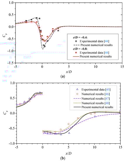 where Ps is the steady-flow-induced pressure at the mudline around the pipe, and is the reference pressure. In the experiments by Bearman and Zdravkovich [44], two values of e/D were examined; i.e., e/D = −0.4, −0.8; and the examined Reynolds number was = 1.5 × 104. Note that the pipe was located at x/D = 0; the negative value of e/D denoted that the pipe was placed above the bed surface. Similarly, Figure 4b shows the numerical results of the distributions of Cp under the conditions of e/D = 0 (i.e., the pipe was just touching the bed surface) and Re = 4.5 × 104. The experimental measurements by Tsiolakis [45] and the previous numerical results [46,47,48] are also provided in this figure for comparison. As shown in Figure 4, the results of Cp calculated with the present model overall agreed well with the existing experimental and numerical results, indicating that the present model was capable of predicting the flow-induced pressure on the seabed surface in the vicinity of the pipeline.