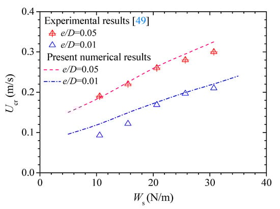 Figure 5 shows the numerically simulated and the measured critical velocity for the lateral instability (Ucr) with various submerged weights of the pipe (Ws) on the silt bed for two values of e/D; i.e., e/D = 0.01, 0.05. As shown in Figure 5, the present numerical results were in reasonable agreement with the data for flume measurements [49]. The critical flow velocity for pipe instability (Ucr) increased approximately linearly with the submerged weight of the pipe (Ws) for a given value of e/D. For a fixed value of Ws, the critical flow velocity Ucr rose for a larger pipe embedment (e/D). It should be noted that, for the examined fine-grained silts with certain cohesion, tunnel erosion beneath the pipe was not observed in the flume experiments, even for the small embedment; e.g., e/D = 0.01. The proposed coupled FE model was capable of predicting the lateral-instability process by employing the aforementioned contact-pair algorithm for describing the pipe–soil interfacial behavior (see Section 2.3.1).