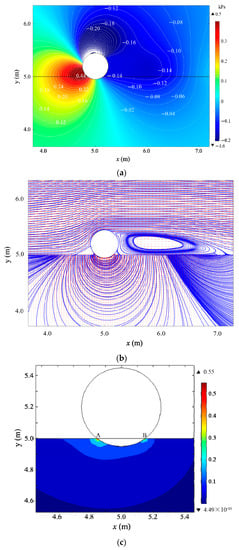 As shown in Figure 6a, for a certain inflow velocity (U = 1.0 m/s), the flow over and the seepage flow beneath the partially embedded pipe could be obtained synchronously, so that the pressure distribution at the water–soil interface was kept continuous. Similar to the observations by Mao [50], due to the presence of the pipe, a large lee-wake vortex was generated at the downstream of pipe, and two small vortices were formed in front and at the rear of the pipe, respectively (see Figure 6b). The flow pressure in front of the pipe was higher than that at the rear of it, which further induced the seepage flow within the soil beneath the pipe. Figure 6b,c give the seepage-flow direction and the contour of hydraulic gradients (i) around the pipe, respectively, indicating the peak values of the hydraulic gradient that emerged at the upstream and downstream corners of the pipe–soil interface (points A and B in Figure 6c). The seepage vectors were generally upward at the downstream zone (see Figure 6b), which could lead to an obliquely upward seepage flow at the seepage exit (i.e., point B in Figure 6c).