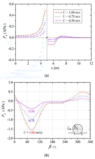 Pressure distributions for various inflow velocities (a) along the mudline around the pipe (the pipe is located at x = 5.0 m) and (b) along the pipe surface.