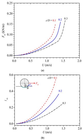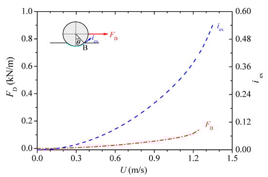 Figure 7a,b give the pressure distributions along the mudline (PS) and around the pipe surface (PP) for various inflow velocities (U), respectively. It is indicated that the flow-induced pressure was generally positive at the upstream of the partially embedded pipe, while negative at the downstream. As the flow velocity increased, the pressure drop increased gradually. The hydrodynamic forces on the partially embedded smooth pipe could be calculated by integrating the pressure distribution around the pipe surface in the water domain (see Figure 2a), which could be decomposed into the in-line (drag force FD) and cross-flow (lift force FL) components. Figure 8 gives the variations of drag force on the pipe (FD) and the hydraulic gradient at the seepage exit (iex) within the soil. As shown in Figure 8, the values of both FD and iex increased nonlinearly with the increase of flow velocity (U), which played decisive roles for triggering either the lateral instability or the tunnel erosion of the pipe.