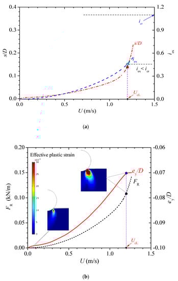 Figure 9a shows the lateral displacement of the pipe (s/D) and the maximum upward hydraulic gradient (iex) with the increase of flow velocity (U), respectively. It is indicated that the values of s/D increased gradually with the increase of U until its critical value was reached (e.g., UcL = 1.20 m/s). The embedded pipe moved obliquely upward progressively (see Figure 9b). As shown in Figure 9b, at a relatively lower flow velocity, the plastic-strain zone was generated dominantly beneath the pipe, especially at the pipe–mudline corners; with further increasing U, the plastic strains extended successively and the soil resistance (FR) was increased correspondingly, resulting in a squeezed plastic zone at the rear of the pipe. According to the criterion (Equation (21)), the critical flow velocity (UcL) for lateral instability could be obtained. It should be noted that, in the process of such lateral instability, the seepage flow was generated concurrently within the soil (see Figure 6), although iex was lower than its critical value for tunnel erosion (i.e., (=1.10); see Figure 9a) in this case study. That is, under the action of ocean currents, the competition between the tunnel erosion and the lateral instability always existed for a pipeline partially embedded in a non-cohesive seabed.