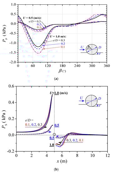 The proposed model was firstly validated against the existing experimental data regarding pressure distribution at the mudline near the pipe laid above or on the bed surface. The calculated distributions of pressure coefficient (Cp) at the mudline in the proximity of the pipe are plotted in Figure 4a, in which the experimental data of Bearman and Zdravkovich [44] are also provided. The pressure coefficient Cp is defined as follows: