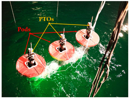The WEC device is a full-scale version of the Dehlsen Associates, LLC multi-pod CENTIPOD [29,32]. A 1:35-scale version of the device is shown in Figure 1. This CENTIPOD device has three floating pods and three spars fixed to a backbone structure. The backbone is anchored using mooring lines, as shown in Figure 2. In its 2-DoF version, each pod is attached to a PTO mechanism in the heave and pitch degrees of freedom. All pods in Figure 2 are assumed identical, and since the CENTIPOD device is an array device, the array effect [33] could become prominent as the significant height of the waves increases and the incident angle of the waves is not parallel to the x-axis in Figure 2. For this study, incident waves are assumed parallel to the x-axis, and for the sea state of interest in this work, the cross-coupling between the pods is very small and is neglected, although it will be investigated in future work.