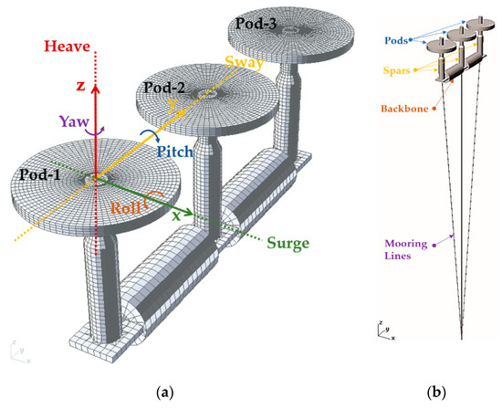 Degrees of freedom for dynamic modeling of CENTIPOD WEC: (a) baseline configuration; (b) model with mooring lines.