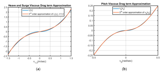The viscous drag force term in (6) is a hard nonlinearity that may lead to convergence issues for the optimization solvers. One solution is to approximate this term with a soft nonlinearity by replacing it with a smooth higher-order polynomial. A third-order polynomial approximation for is used in the surge and heave direction, where the range of interest of velocity is , and a fifth-order polynomial approximation is used for pitch direction, where the range of interest of velocity is . With, being the polynomial coefficient for degree polynomial curve fit