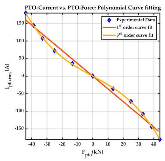 The case study scenario is taken from McCleer Power’s Linear PTO generator [3] with the PTO force–current characteristics given by Figure 4. We can approximate the experimental data in Figure 4 with a mathematical relation, such as a piecewise linear function or a nonlinear function. We have used polynomial approximation which is a smooth function. This relation is described by a third-order curve fit between the PTO current and the PTO force,