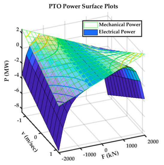 The PTO cost functional surface in (28) is plotted in the PTO velocity–force plane, as shown in Figure 5. The surface plot of the mechanical PTO power, is non-convex, as shown in Figure 5. However, the electrical PTO power surface, in (26) has a quadratic power loss term, and it gives convexity to the electrical power surface along the PTO force axis in Figure 5.