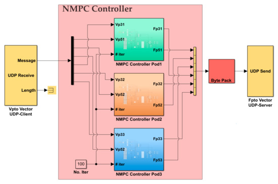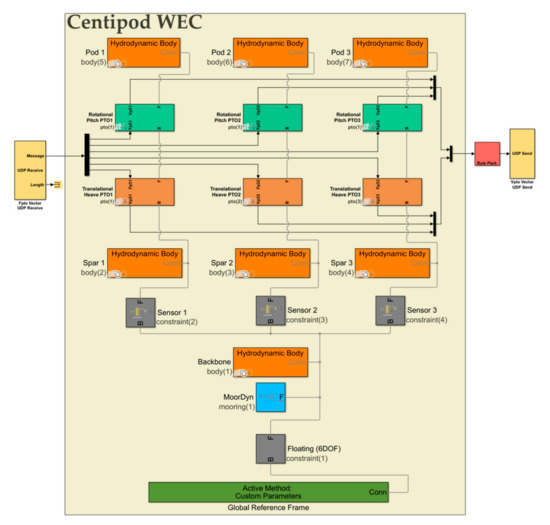 The schematic diagram of the test setup is shown in Figure 6. The corresponding hardware setup is shown in Figure 7. NMPC is designed in the host machine, which generated code and deployed the controller to the Speedgoat performance real-time target machine [31], model-109100 with Intel Core i3 3.3 GHz, two cores, and 2048 MB DDR3 RAM. The Speedgoat machine is interfaced with a real-time WEC emulator machine through an Ethernet universal data port (UDP) channel. The three WEC pods in Figure 1 are assumed identical, and the same controller is implemented for each pod as shown in Figure 8, while the cross-coupling between pods is ignored for this work. The physical velocity and force constraints of the PTO mechanisms imposed as , and . The emulated WEC-Sim model of CENTIPOD device is shown in Figure 9.