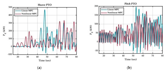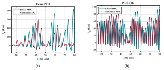Instantaneous electrical PTO power output for 2-DoF Pod-1 with linear and nonlinear MPC under nonlinear hydrodynamic conditions in WEC-Sim and : (a) Pod-1 Heave PTO; (b) Pod-1 Pitch PTO.