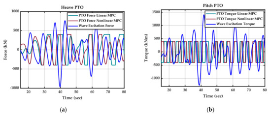 The PTO force and wave excitation force profiles for 2-DoF Pod-1 with linear and nonlinear MPC under linear hydrodynamic conditions in WEC-Sim and : (a) Pod-1 Heave PTO; (b) Pod-1 Pitch PTO.