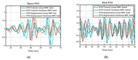 The average electrical power output results for the heave and pitch PTOs for 2-DoF pod-1 are shown in Figure 10a and Figure 10b, respectively, for linear MPC and NMPC subjected to linear hydrodynamic conditions. Here, we consider the exponentially weighted moving average (EWMA) with the forgetting factor set to unity. The instantaneous electrical power output results corresponding to Figure 10 are shown in Figure 11. The PTO force and wave excitation force profiles for 2-DoF Pod-1 with linear and nonlinear MPC under linear hydrodynamic conditions are shown in Figure 12. The PTO velocity and displacement plots for 2-DoF Pod-1 with linear and nonlinear MPC under linear hydrodynamic conditions are shown in Figure 13.