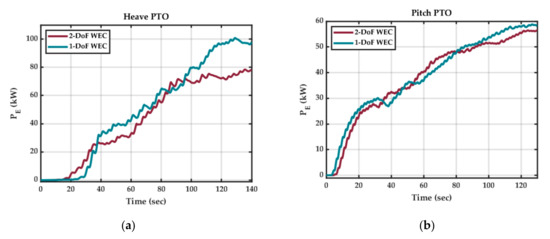 The average electrical power output results per PTO for 1-DoF and 2-DoF Pod1 with NMPC from Figure 16 are summarized in Table 6. In moving from 1-DoF WEC to 2-DoF WEC, a 35% increase in output power is obtained compared to heave only, and 129% increase compared to pitch only.