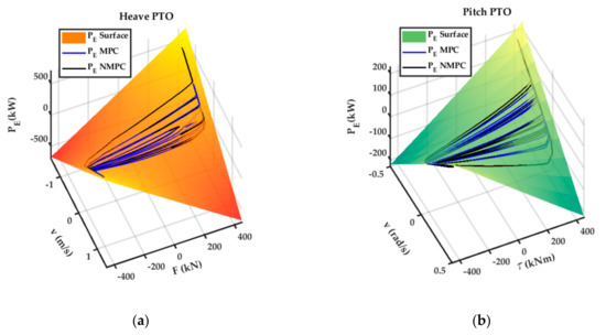 The locus of electrical PTO power on the electrical power cost functional surface for linear MPC and NMPC under nonlinear hydrodynamic conditions in WEC-Sim and : (a) Pod-1 Heave PTO; (b) Pod-1 Pitch PTO.