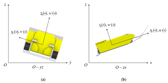 Figure 1 shows a right-handed Cartesian coordinate system consisting of an earth-fixed coordinate system () and a body-fixed coordinate system () on the horizontal and vertical planes, respectively. The trajectory and attitude of the amphibious vehicle are represented in the earth-fixed coordinate system, while the external force acting on the vehicle and the equations of motion are expressed in the body-fixed coordinate system.
