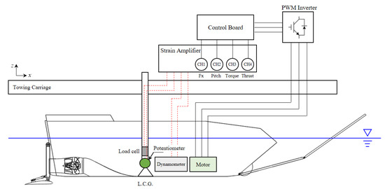 Figure 4 shows the test setup for the tests. In the test model, a dynamometer that can measure the thrust and torque of the impeller and a load cell that can measure the x-directional component of the force were installed. The pitch angle of the model was measured using a potentiometer, the axis of which was aligned at the intersection of the x-directional center of mass of the model and the impeller shaft line. The revolution rate of the waterjet impeller was controlled by a pulse width modulation (PWM) inverter, and the revolution rate of the impeller shaft was also recorded by a rotary encoder.