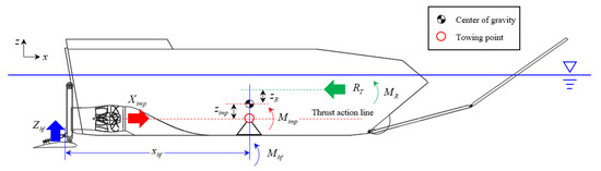Figure 5 shows a schematic of pitch moment separated by the waterjet and hydrofoil. The waterjet axis is designed to intersect with the vertical center of buoyancy, that is, the towing point, which is usually lower than the center of gravity. The difference between the towing point and the center of gravity is defined as . is the thrust generated by the waterjet operation, which is a function of the impeller revolution rate. The pitch moment caused by the waterjet thrust is derived as follows.