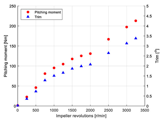 changes according to the vertical center of gravity, but in this study, the center of gravity in the design condition is applied. So, the pitching moment and can be expressed as and , respectively. The contribution of exhaust flow to the foil lift can be identified by the bollard pull test with the model impeller revolution rate () variation. The trim in changing is measured while the model advance speed is fixed as zero. Figure 6 shows the trim and pitch moment with variation. The pitch moment is estimated with the underwater geometry of the vehicle. An increase in generates lift force by the hydrofoil on the stern and thereby produces larger bow trim.