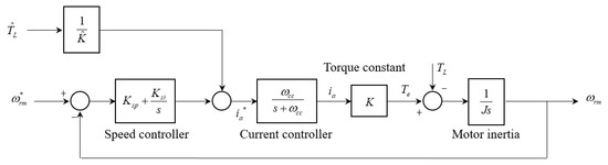where and are proportional (P) and integral (I) gains of speed controller, respectively, K is a torque coefficient, and is the inertia of the system. The closed-loop transfer function of the speed control system is as follows.