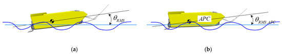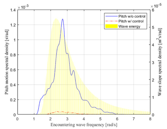 Another approach is to use Fourier analysis with spectral analysis for the pitch motion energy spectrum corresponding to the sea state 2. Fourier transform was performed on the measured time series signal to obtain the pitch amplitude for each wave encountering frequency. Then, in the sea state 2, the pitch transfer function defined as RAO () can be obtained by dividing by the wave slope () corresponding to each frequency. The pitch motion energy spectrum can be obtained by superpositioning the obtained RAO with the wave energy spectrum, expressed as Equation (18). The solid and dashed lines shown in Figure 17 indicate the case where the controller is not applied and the case where it is applied, respectively.
