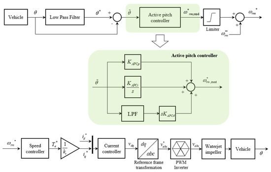 In the case of a general waterjet system, a mechanical power device such as a diesel engine is installed to rotate the impeller. In the case of the engine, it is possible to control the revolution rate, but it is hard to achieve precise dynamic performance for ship control because it is usually connected to the propulsion shaft through a reduction gear. However, if the impeller is driven by an electric motor, it is possible to control the revolution rate of the motor dynamically. Since the dynamic performance of an electric propulsion system is more precise than that of a mechanical propulsion system, it can be more effectively used for pitch motion control.