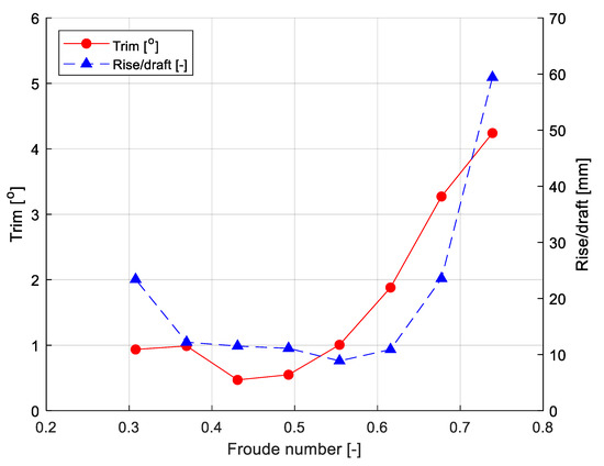 Self-propulsion tests were conducted for various towing speeds. The revolution rate of the self-propulsion point at each forward speed, trim angle, and rise were measured during self-propulsion tests in calm water. The self-propulsion point was determined when the resistance and thrust are in equilibrium at the design advance speed. The equilibrium point was found by measuring external force on the model while varying the rotor revolution rate. As shown in the coordinate system of Figure 1, the trim angle is a negative sign when the bow is raised, and the rise is a positive sign in the vertical upward direction. The trim angle and rise according to the Froude number () are shown in Figure 11.