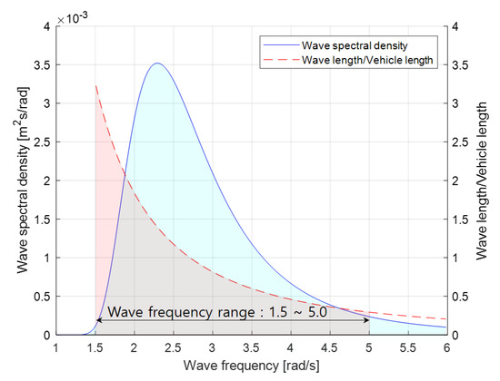 Assuming that the amphibious vehicle operates in the sea state 2, the regular wave frequencies are determined. As shown in Figure 12, the range of wave frequencies with large wave energy is about 1.5 to 5.0, and when this frequency range is converted to the dimensionless wavelength (), it is about 0.5 to 3.5. For this reason, is set as shown in Table 2 to include all wave frequencies in which wave energy exists. To satisfy the linear surface wave, the wave steepness should be small, and if is less than 1/50, the linear surface wave is generated. To satisfy these conditions, the wave height is determined as listed in Table 2.