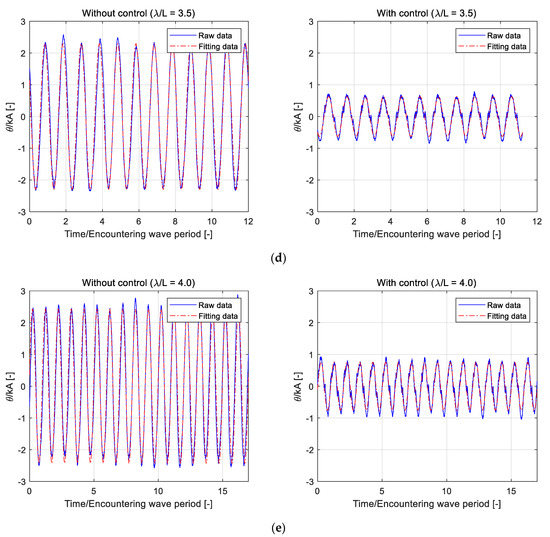 Both the case where the controller was applied and the case where the controller was not applied were performed under the conditions of wave direction 180° and 8 regular wave frequencies. Figure 13 shows the comparison results of regular wave tests without control and with control cases. The fitting data means the result of using the least square method assuming that the frequency of pitch motion is the same as the wave encountering frequency as sinusoidal fluctuation . Here, denotes the amplitude of pitch. The pitch is divided by wave steepness to express dimensionless motion angles, and the time is divided into an encountering wave period to make it dimensionless. The encountering wave frequency and period are expressed as Equations (14) and (15), respectively.