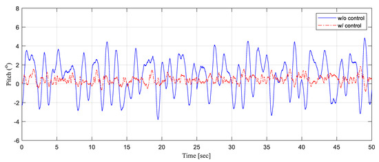 In Figure 17, it can be seen that the frequency distribution of motion energy is significantly different from the case where the controller is applied and the case where it is not. Using this motion energy spectrum, the pitch RMS was calculated and compared, and it is described in Table 4. Both the statistical analysis defined in Equation (17) and the spectral analysis defined in Equation (19) show similar results, and when the controller is applied, the pitch motion reduction result is approximately 61%.