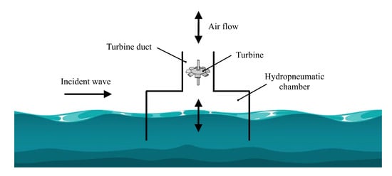 Nowadays, it is estimated that the global energy consumption is already six times greater than it was in 1950 and it is projected to grow at around 55% by 2030 [1]. Considering the environmental impact of using traditional energy sources, there is a growing search for alternative energy sources. In this scenario, renewable energies stand out, since they come from regenerative resources, do not deplete over time, and have low environmental impact, in addition to reducing carbon emissions [2]. Although approximately 80% of the global primary energy comes from fossil fuels, Brazil stands out in terms of the use of renewable sources, where these represent 80.4% of the domestic electricity supply [3,4]. Among the various renewable energy sources, oceans are gaining prominence, since they cover more than 70% of the Earth’s surface [5]. Although progress in the commercialization of ocean energy is still relatively slow, the energy potential of the oceans is promising; part of this is due to the fact that the technology needed to harvest and produce this type of energy is still under development [6]. Recently, Espindola and Araújo [7] mapped the capacity, in kW/m, along the Brazilian coast, concluding that the mean wave power varies around 8 to 21 kW/m. Among the different types of devices which convert sea wave energy into electrical energy, the oscillating water column (OWC) type device is possibly the most extensively studied [8]. An OWC device consists basically of four parts, these are hydropneumatic chamber, turbine duct, turbine and generator. The hydropneumatic chamber, which can be fixed or floating, is a structure whose bottom is open, below the water surface, thus retaining the air trapped inside the chamber and above the free surface; the movement of the waves then causes the air to be continuously compressed and decompressed, flowing through a turbine coupled to a generator. A schematic representation of this device operating principle can be seen in Figure 1.