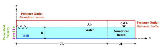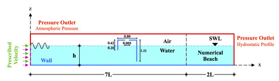 When dealing with numerical simulations of coastal scenarios, proper wave generation is a fundamental step to achieve reliable results. The computational domain in this case is a two-dimensional numerical wave channel (NWC), with a length of 65 m, which corresponds to approximately 9 times the wavelength (L = 7.54 m), height of 6 m, and water depth (h) of 4 m. As adopted by Lisboa et al. [34], two wavelengths on the extremity of the NWC have been dedicated to be a numerical beach, thus being responsible for wave damping and avoiding wave reflection.