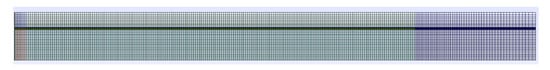 In addition to the spatial discretization tested for the wave channel, a refinement zone of two wavelengths, i.e., one wavelength to each side of the OWC, was applied to the area around the device. Inside this refinement zone, mesh elements had a horizontal and vertical size of 0.01 m, except for the slot opening region, where the horizontal size of elements were 0.0025 m. The mesh used for the study validation can be seen in Figure 8.