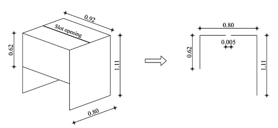 In addition, for the computational domain, a simplification regarding the experiments was made. In the laboratory, the distance between the OWC model and each side wall of the tank was 2.54 m; since this value is more than twice the width of the OWC model, wave reflection was considered negligible. Therefore, a two-dimensional computational domain was adopted for this study. Figure 6 shows the dimensions of the physical model, as well as its cross-section, used in the two-dimensional computational domain, and Figure 7 shows the computational domain used in the validation procedure.