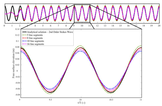 As shown in Figure 2 and Figure 3, the prescribed velocity boundary condition is assigned to the line segments at the entrance of the channel. Each segment receives different values corresponding to the horizontal and vertical wave velocity components u and w, respectively. However, the optimal discretization, i.e., the number of line segments that provides a proper wave generation, must be analyzed. Therefore, the number of segments were evaluated over 2 min of simulation, comparing free surface elevation when using 5, 8, 10, and 16 line segments at the velocity inlet region.