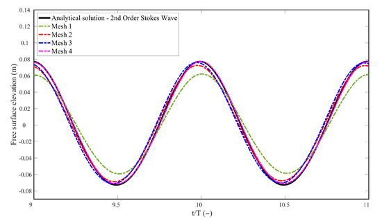 The analysis was performed using Equation (11) and compared both numerical and analytical free surface elevation at position x = 10.00 m. It should be mentioned that, at the beginning of every simulation, the wave channel is at rest and, due to the flow inertia, the first waves generated are more dampened, as it can be seen in Figure 10, leading to considerable deviations in the comparison with the analytical results. Therefore, this interval of time in which wave generation is not stable was disregarded. The comparison between the free surface elevation of each mesh tested and the analytical solution is presented in Figure 12, and the corresponding NRMSE values are presented in Table 4.