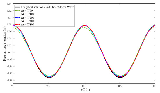 To ensure a proper wave generation, temporal discretization was also studied and time step () tests were performed. Liu et al. [14] indicate that numerical accuracy is ensured when is less than T/50, where T is the wave period. Therefore, values of T/50, T/100, T/200, T/400, and T/800 were tested. It is worth highlighting that, before this test was performed, the time step adopted for the simulations was T/400 [40].