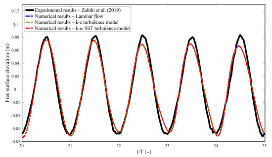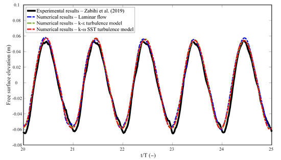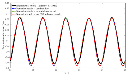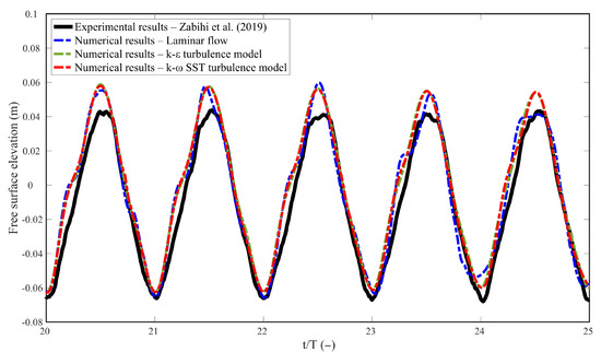 As mentioned in Section 2.2, a numerical beach was also implemented to prevent wave reflection at the end of the wave channel, which would interfere with free surface elevation along the channel. For a proper wave damping, five linear damping coefficient () values were tested, as presented in Figure 4. Figure 11 shows the free surface elevation at the end of the channel for each value of adopted.