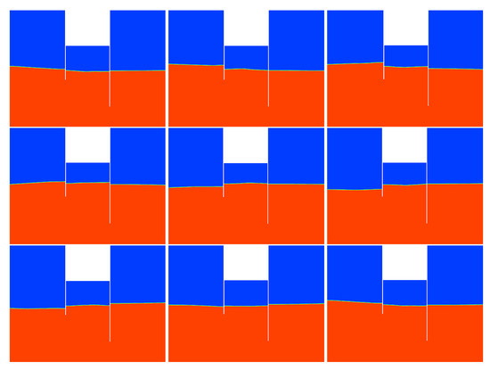 In addition, water free surface flow for nine instants along a wave period is presented in Figure 18. One can observe how wave crests and troughs are more accentuated previously to the hydropneumatic chamber than afterwards, due to the wave damping when interacting with the walls of the device.