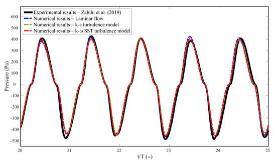 Then, the OWC device was inserted into the numerical wave channel and three simulations were performed, using either laminar flow or turbulent flow, with turbulence models k- and k- SST. With the results obtained from these simulations, the free surface elevation obtained by the numerical gauges located outside and inside the hydropneumatic chamber was compared with wave gauges WG1, WG2, WG3, and WG4 (see Figure 9 for more details). The pressure obtained by the numerical probe located inside the hydropneumatic chamber was also compared with the pressure sensor used in the experiment.