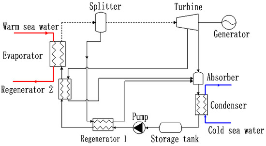 The cycle system proposed by the First Institute of Oceanography, Ministry of Natural Resources [25], is shown in Figure 1. This cycle has the following characteristics: Firstly, the ammonia vaporized from the evaporator first passes through the separator, which ensures the purity of the gas passing through the turbine, and on the other hand, the lean ammonia solution from the separator passes through the regenerator 1, and preliminary heating of the solution from the pump to improve energy utilization. Second, part of the ammonia from the separator passes through the turbine to perform work, and the other part of the ammonia passes through the regenerator 2 to continue to heat the solution from the regenerator 1. The efficiency of the system is improved by fully applying the absorbed heat [16].