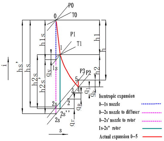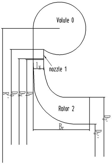 In addition, and are the rotor isentropic enthalpy drop and permeability enthalpy drop, respectively, calculated by Equations (4) and (5), ,, are the diameter and circumferential velocity of rotor inlet and outlet, is the ideal isentropic speed, calculated by Equation (6).
