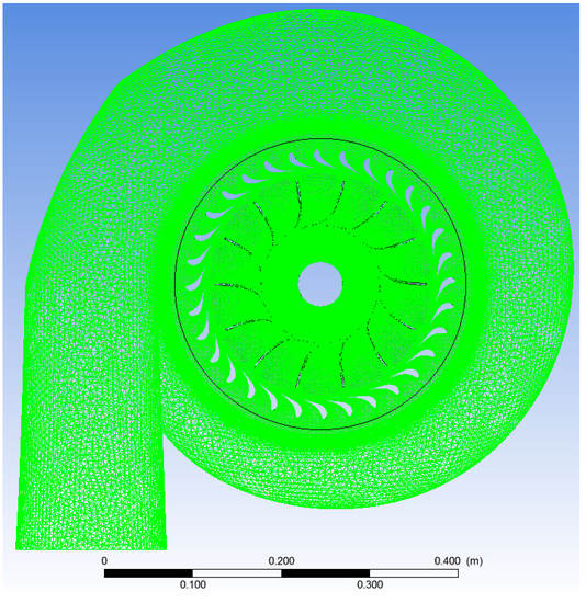 Based on the one-dimensional calculation, the corresponding three-dimensional modeling and meshing of the pneumatic components of the turbine are carried out. The volute is divided into tetrahedral meshes, whose tongue is locally encrypted. The rotor and stator are divided into hexahedral mesh, and the value of y+ near the wall of which is set to 30, and the O-shaped mesh is used to encrypt it. The overall grid assembled in the CFX pre-processing is shown in Figure 4, and the diffuser is not shown for the convenience of display.