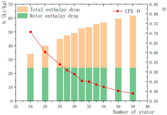 The effect of the number of stator blades on the total enthalpy drop of the turbine, the enthalpy drop of the rotor and the degree of reaction is shown in Figure 6. It can be seen from the figure that as the number of stator blades increases, the total enthalpy drop of the turbine increases, while the rotor enthalpy drop decreases, and the degree of reaction decreases as the number of stator blades increases. Along with the increase in the stator blades, the gas flow in the stator is more uniform and closer to idealization, so the total enthalpy drop of the turbine increases. However, the stator blades have a thickness, and the increase of the stator blades has a certain blocking effect. In the same situation, the speed of the stator outlet will increase, causing impact loss at the rotor inlet, so the rotor enthalpy drop decreases as the stator blades increase.