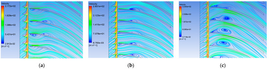 Velocity streamline diagram of 50% leaf height under different number of stator blades. (a) The number of stator blades is 24; (b) the number of stator blades is 30; (c) the number of stator blades is 38.