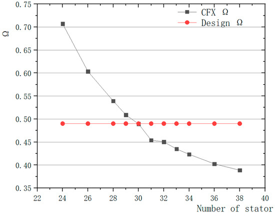 According to the above optimization method, 11 sets of design values are selected within the range of the number of stator blades from 24–38, which are respectively modeled and simulated in a full three-dimensional state. The influence of different blade numbers on the performance of the turbine is analyzed and the following results are obtained.
