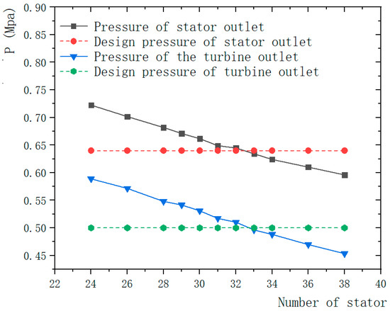 Comparison of design value and simulation value of turbine inlet and outlet pressure and stator outlet pressure at different number of stator blades.